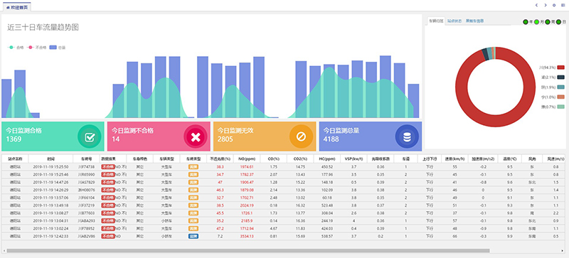 尾氣遙感檢測平臺實現(xiàn)了對機動車尾氣數(shù)據(jù)的采集、管理維護功能。可以實時查詢固定式站點監(jiān)測數(shù)據(jù)及移動式站點監(jiān)測數(shù)據(jù)。所監(jiān)測的數(shù)據(jù)信息涵蓋了機動車尾氣檢測參數(shù)值、氣象參數(shù)數(shù)據(jù)、環(huán)境空氣質(zhì)量數(shù)據(jù)、黑煙車數(shù)據(jù)等。同時結(jié)合環(huán)境空氣質(zhì)量數(shù)據(jù)與尾氣檢測數(shù)據(jù)進行統(tǒng)計分析,并與交管局、車管所進行數(shù)據(jù)庫對接。形成了實時查詢和匹配車輛基本信息于一體的數(shù)據(jù)檢測、統(tǒng)計、分析系統(tǒng)。