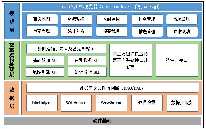 系統(tǒng)的主要功能模塊包括:電子地圖、實時監(jiān)控、數(shù)據(jù)查詢、報警管理、站點排名、統(tǒng)計分析、網(wǎng)絡監(jiān)控、噴淋聯(lián)動、系統(tǒng)管理、運維管理。