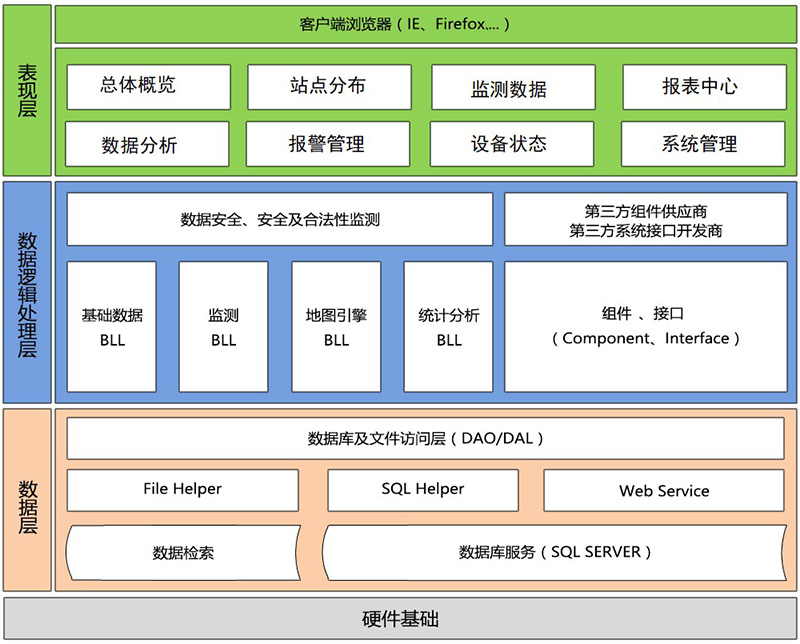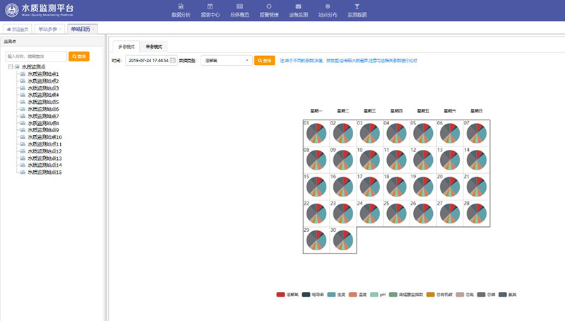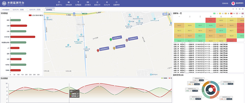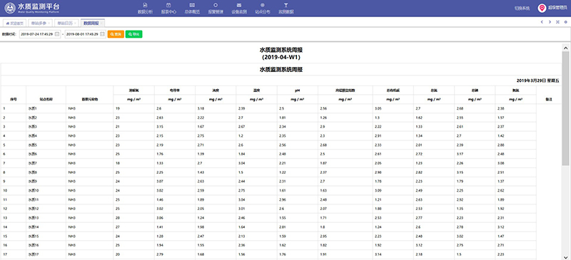 平臺采用B/S結(jié)構(gòu),實現(xiàn)基于GIS的面向水質(zhì)在線監(jiān)控系統(tǒng),能夠及時掌控各重點水質(zhì)監(jiān)測點位水溫、pH、溶解氧、電導率、濁度、高錳酸鹽指數(shù)、總有機碳(TOC)、氨氮數(shù)據(jù)狀況。系統(tǒng)的主要功能模塊包括:站點分布、監(jiān)測數(shù)據(jù)、總體概覽、報表管理、數(shù)據(jù)分析、排放分析、報警管理和系統(tǒng)管理。