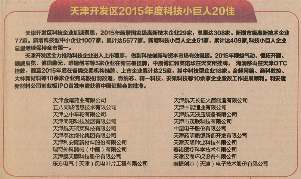 天津同陽科技被評(píng)為開發(fā)區(qū)2015年度科技小巨人20佳