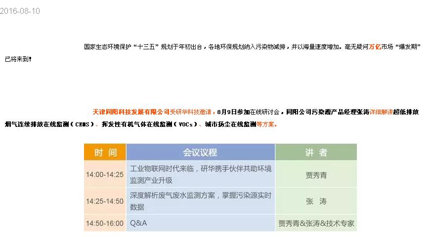 【環(huán)保十三五】天津同陽科技受邀參加環(huán)保行業(yè)在線研討會 更新時間:2016-08-05 點擊:21021 所屬欄目:公司新聞 Update Time:2016-08-05 Hits:21021 Belong Column:News 【環(huán)保十三五】天津同陽科技受邀參加環(huán)保行業(yè)在線研討會
