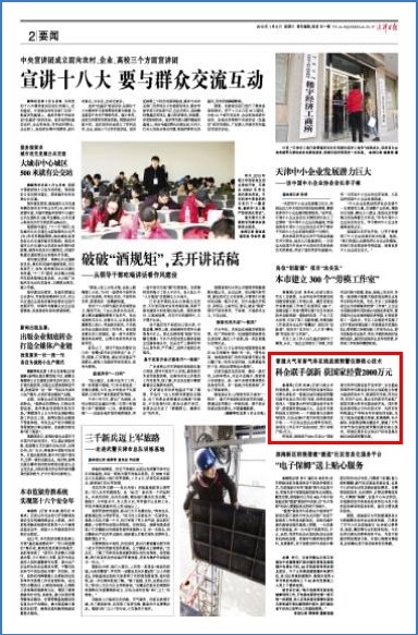 天津日?qǐng)?bào):科企聯(lián)手創(chuàng)新 獲國(guó)家經(jīng)費(fèi)2000萬(wàn)元