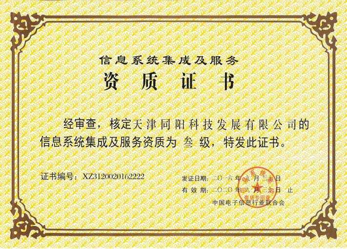 天津同陽科技獲得叁級信息系統(tǒng)集成及服務(wù)資質(zhì)證書 更新時間:2016-10-12 點(diǎn)擊:22770 所屬欄目:公司新聞 Update Time:2016-10-12 Hits:22770 Belong Column:News 天津同陽科技發(fā)展有限公司獲得叁級信息系統(tǒng)集成及服務(wù)資質(zhì)認(rèn)證。