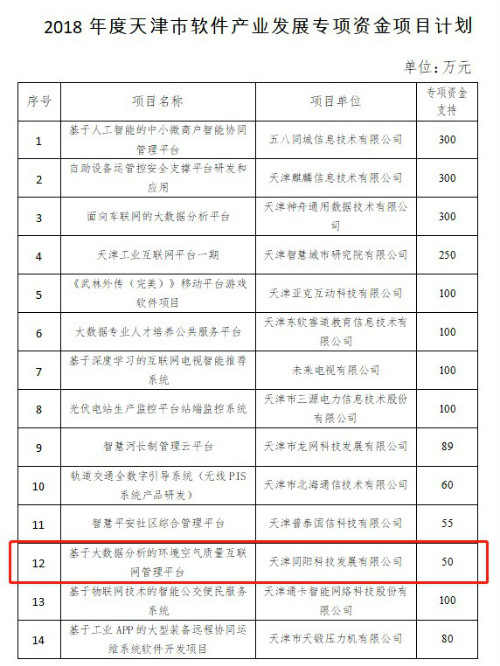 同陽科技被列入2018年天津市軟件產(chǎn)業(yè)發(fā)展專項(xiàng)計(jì)劃名單