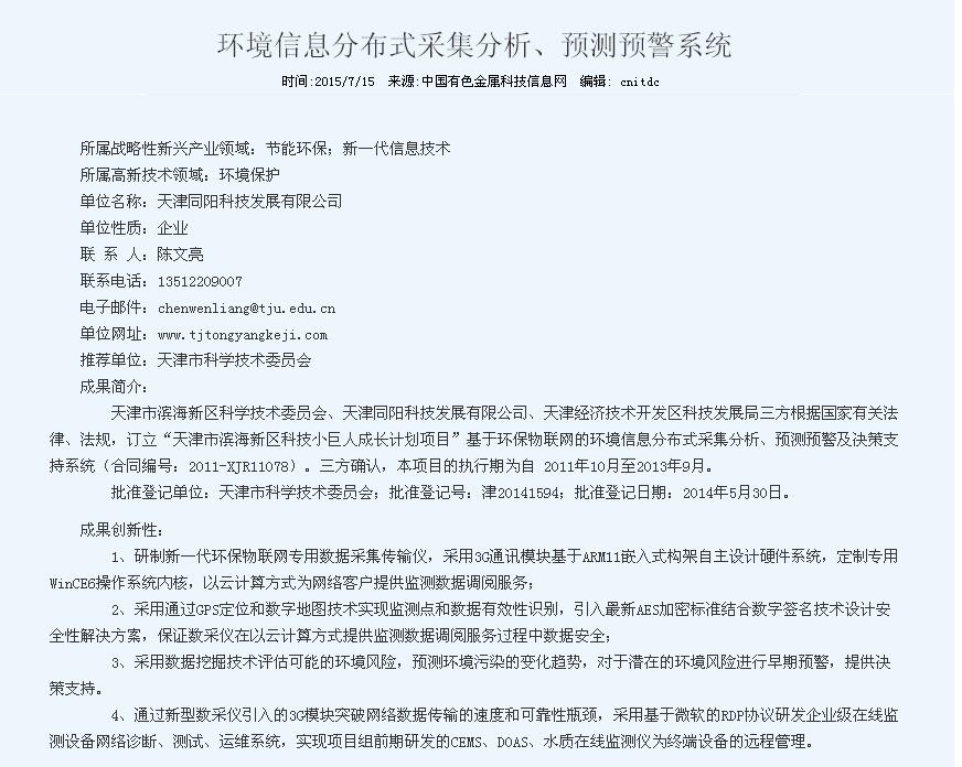天津同陽科技申報的“環(huán)境信息分布式采集分析、預測預警系統(tǒng)”項目,獲得天津市濱海新區(qū)科學技術進步三等獎。