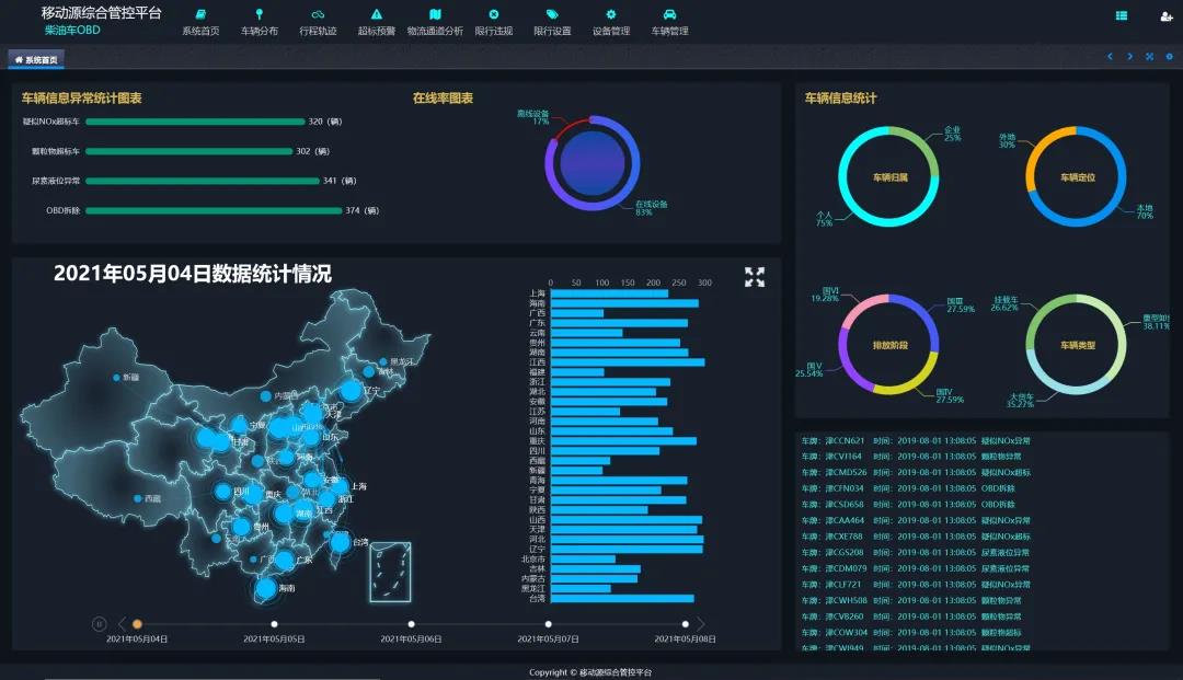軟件平臺(tái)功能包括:GIS一張圖展示、車輛分布、形成軌跡管理及超標(biāo)報(bào)警查詢等。該系統(tǒng)通過(guò)一張GIS圖展示在線柴油貨車所在位置的熱力圖、車輛的分類比例以及排放階段占比等,可動(dòng)態(tài)滾動(dòng)播放柴油貨車的預(yù)警報(bào)警信息。