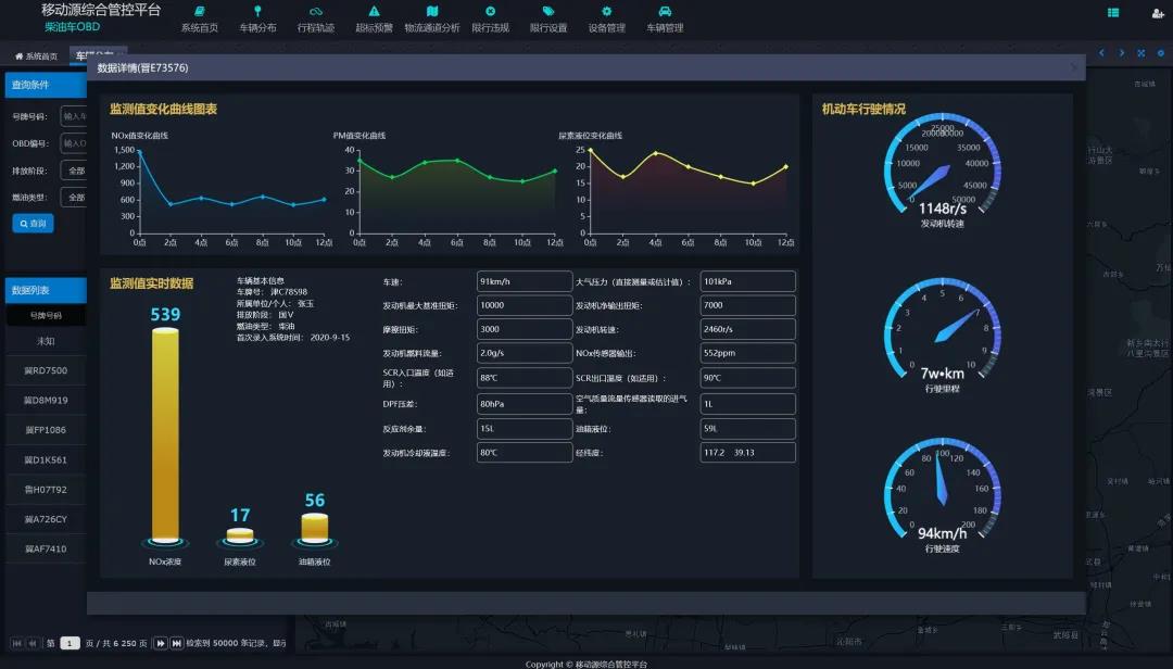 客戶可根據(jù)需要通過(guò)查詢功能查看某一輛柴油貨車的位置、里程、實(shí)時(shí)車速、污染物排放曲線和尿素消耗曲線等詳細(xì)信息。