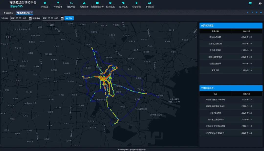 該系統(tǒng)可通過(guò)大數(shù)據(jù)分析功能識(shí)別城市的重點(diǎn)物流通道以及分析黑加油站點(diǎn)等功能,可為政府部門對(duì)限行規(guī)則和油品管控提供指導(dǎo)性意見。