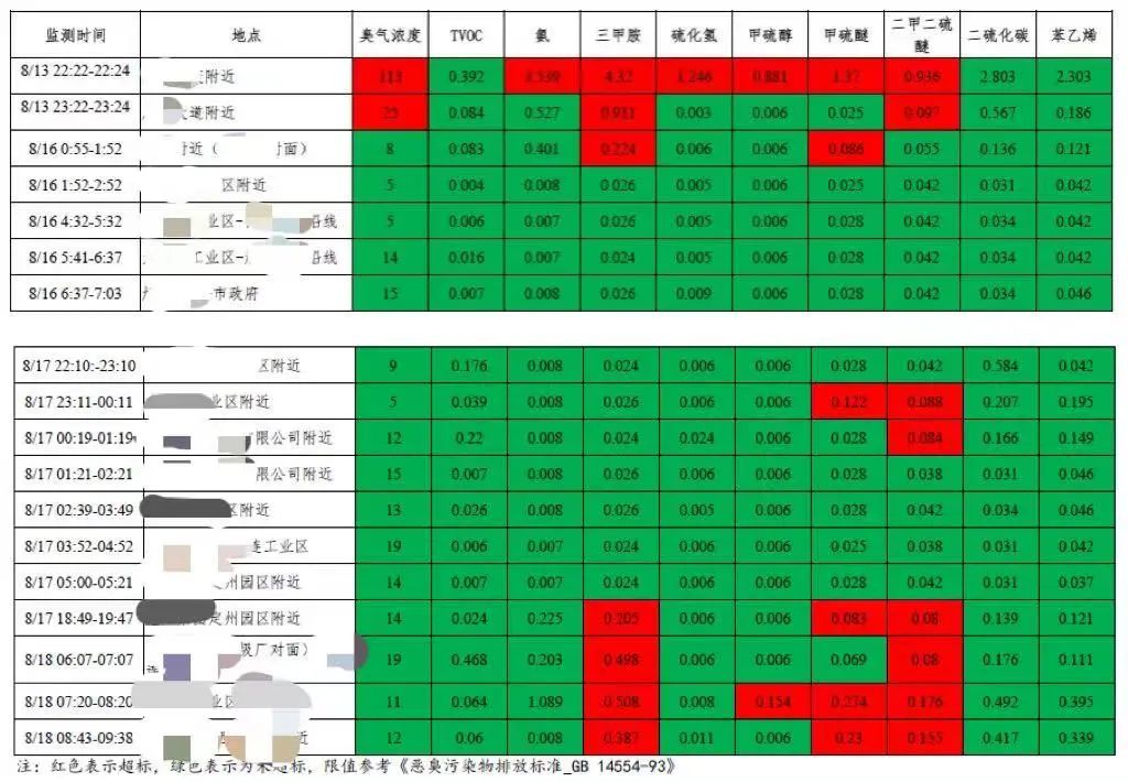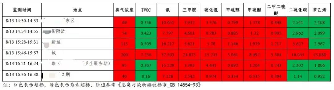 針對(duì)某市重點(diǎn)涉氣企業(yè)進(jìn)行惡臭走航監(jiān)測(cè),結(jié)果顯示某固廢附近、某垃圾廠對(duì)面、某工業(yè)區(qū)及某企業(yè)廠界附近均出現(xiàn)惡臭超標(biāo)現(xiàn)象。尤其是某固廢附近,在一處垃圾處理車間附近有刺鼻惡臭,監(jiān)測(cè)數(shù)據(jù)顯示臭氣濃度、氨、三甲胺、硫化氫、甲硫醇、甲硫醚、二甲二硫醚均處于高濃度,分別超標(biāo) 4.7 倍、1.4 倍、53.0倍、19.8 倍、124.9倍、18.6 倍、14.6 倍,惡臭污染嚴(yán)重。監(jiān)測(cè)期間,甲硫醇、甲硫醚、二甲二硫醚濃度均明顯上升,且均超標(biāo)。