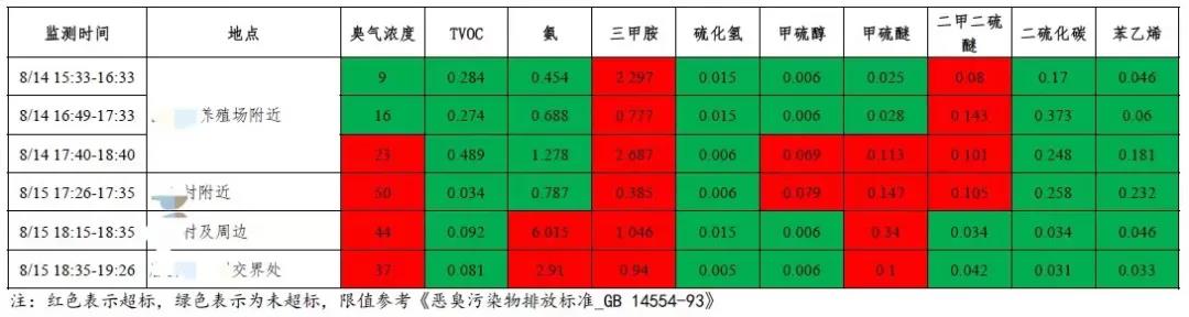 某市農(nóng)業(yè)源惡臭來源主要包括養(yǎng)殖場(chǎng)、屠宰場(chǎng)、貯糞場(chǎng)等,糞便、動(dòng)物屠宰后的內(nèi)臟露天堆放以及水體富營養(yǎng)化致使其周邊惡臭污染十分嚴(yán)重。本次惡臭走航主要針對(duì)某市西北方向的某三個(gè)村落進(jìn)行監(jiān)測(cè),監(jiān)測(cè)結(jié)果顯示A村附近畜禽養(yǎng)殖場(chǎng)惡臭污染嚴(yán)重,兩次(14 日、15日)走航均監(jiān)測(cè)出臭氣濃度、三甲胺、二甲二硫醚超標(biāo)情況,尤其是三甲胺,峰值濃度超標(biāo)32.6倍,且三甲胺具有爛魚臭,極大影響周邊居民生活質(zhì)量。此外,在B村附近監(jiān)測(cè)出臭氣濃度、氨、三甲胺、甲硫醚超標(biāo),其為畜禽糞便堆肥場(chǎng)的典型惡臭因子,經(jīng)現(xiàn)場(chǎng)巡查發(fā)現(xiàn)超標(biāo)點(diǎn)位周邊確實(shí)存在大型養(yǎng)殖場(chǎng)及大面積露天貯糞場(chǎng)。
