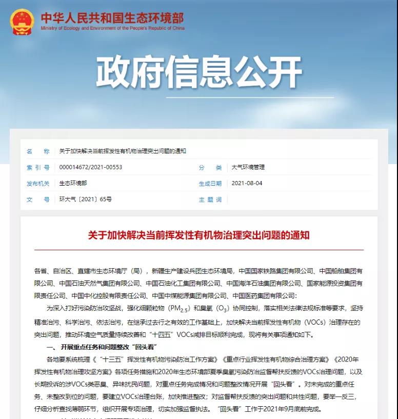近日,生態(tài)環(huán)境部發(fā)布了《關(guān)于加快解決當(dāng)前揮發(fā)性有機(jī)物治理突出問題的通知》文件,文件指出:針對(duì)長(zhǎng)期投訴的涉VOCs類惡臭、異味擾民問題,要對(duì)重點(diǎn)任務(wù)完成情況和問題整改情況開展“回頭看”,推動(dòng)環(huán)境空氣質(zhì)量持續(xù)改善和“十四五”VOCs減排目標(biāo)順利完成。