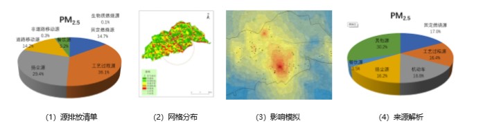 基于顆粒物濃度及化學(xué)組分監(jiān)測(cè)數(shù)據(jù),利用化學(xué)質(zhì)量平衡模型(CMB)、正交矩陣因子分析模型(PMF)等受體模型 進(jìn)行擬合運(yùn)算,定量解析各主要排放源類對(duì)PM2.5、PM10 的貢獻(xiàn)值和分擔(dān)率,確定針對(duì)顆粒物污染防治的重點(diǎn)管控源類。基于動(dòng)態(tài)更新的大氣污染源排放清單,結(jié)合近地面污染物監(jiān)測(cè)數(shù)據(jù)和氣象數(shù)據(jù),針對(duì)PM2.5等大氣污染防治的重要指標(biāo),通過(guò)中小尺度數(shù)值模式模擬及可視化面分析,提供基于轄區(qū)、街鎮(zhèn)級(jí)別區(qū)域、細(xì)分源類的來(lái)源分析以及與預(yù)